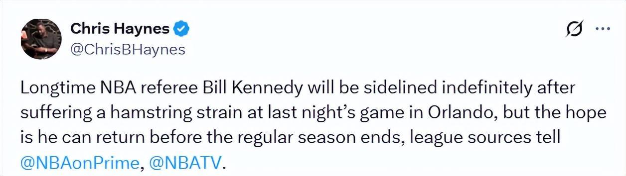 赛后,联盟官方宣布,肯尼迪因右腿伤势确定退出本场剩余执裁工作。